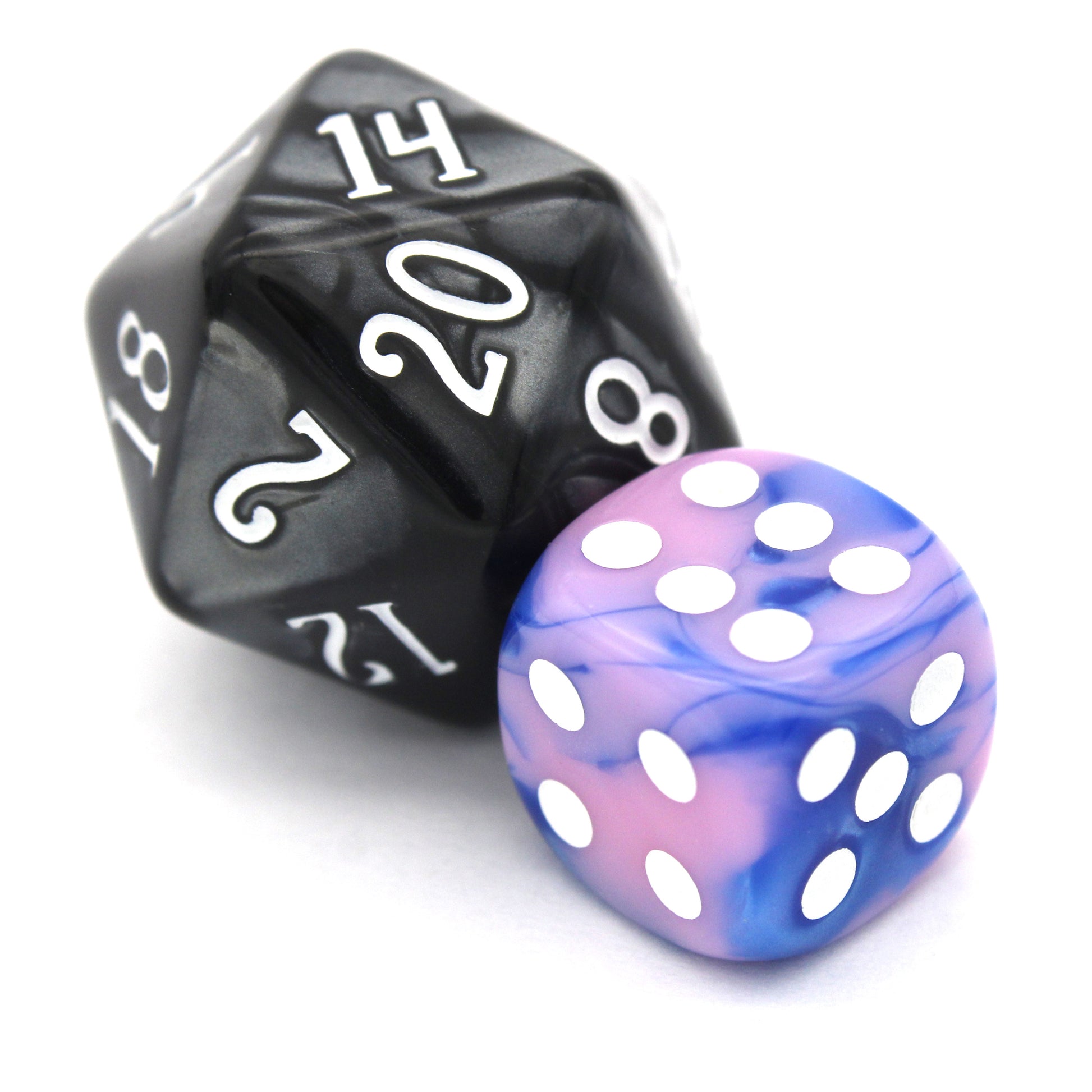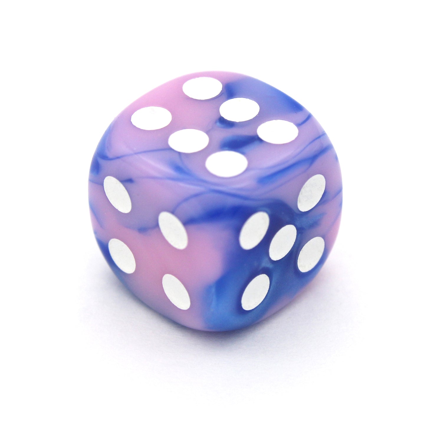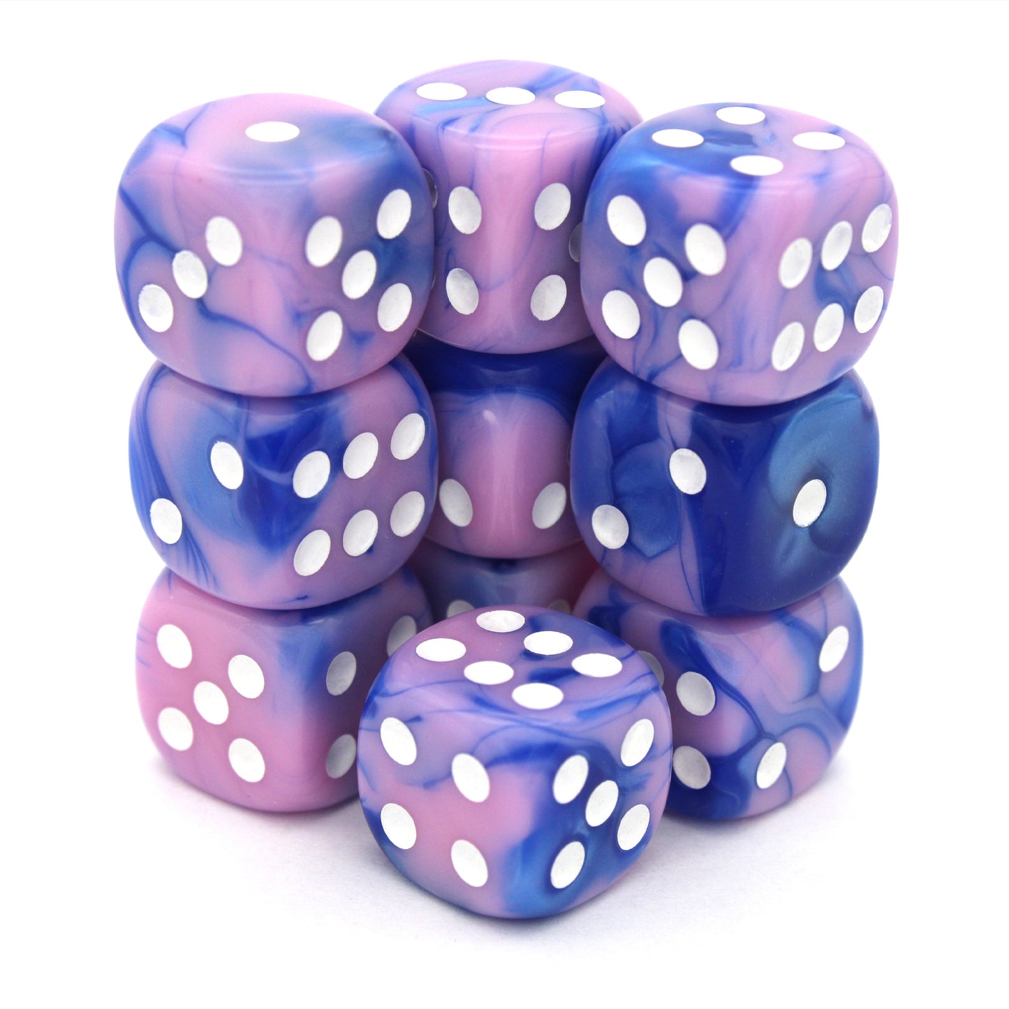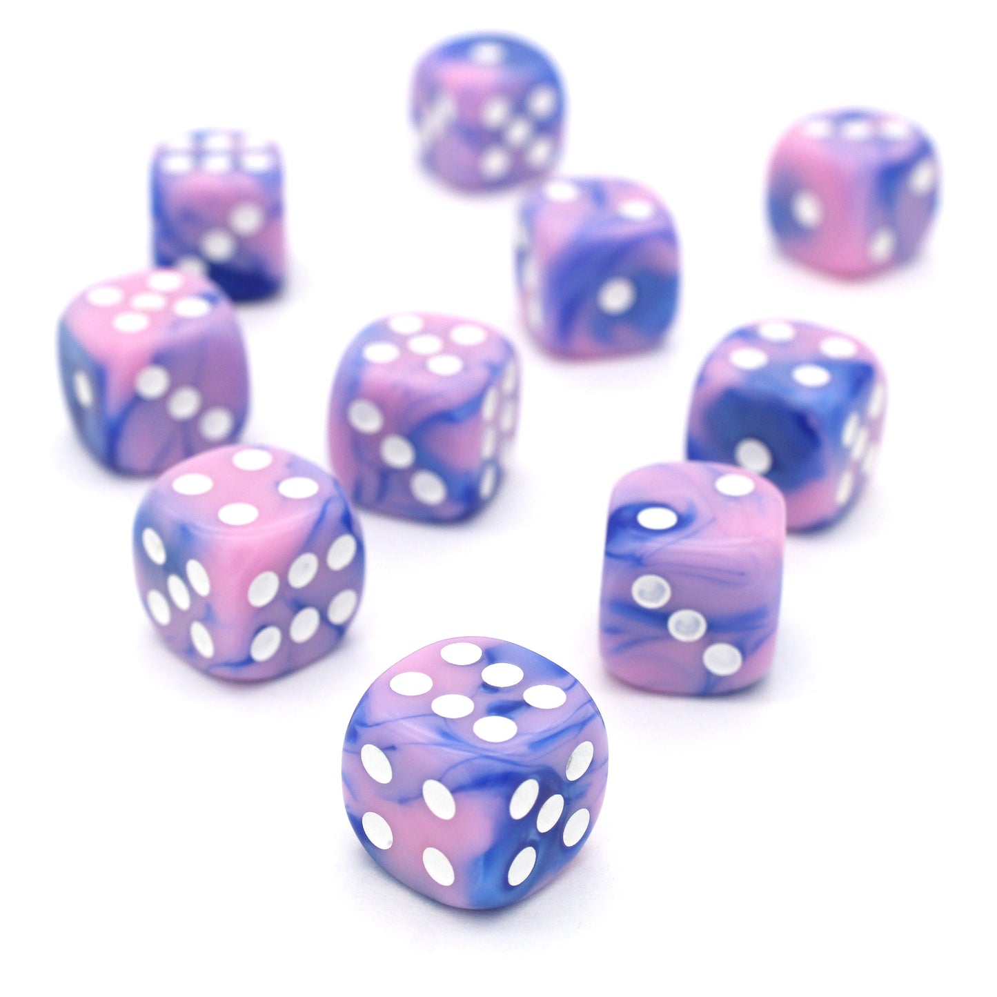 Cotton Candy Criminals is a 10-piece set of swirled blue and pink 12mm d6s, with pips inked in white. They are part of our Pip-Squeaks collection.