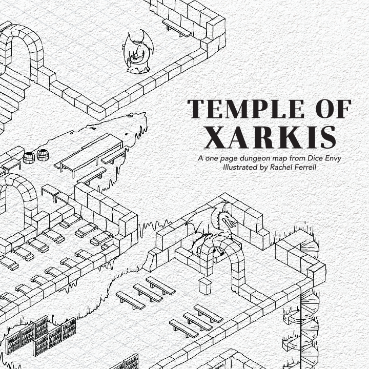 Temple of Xarkis isometric dungeon map, with a one page dungeon description