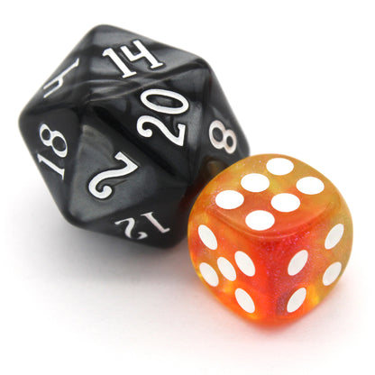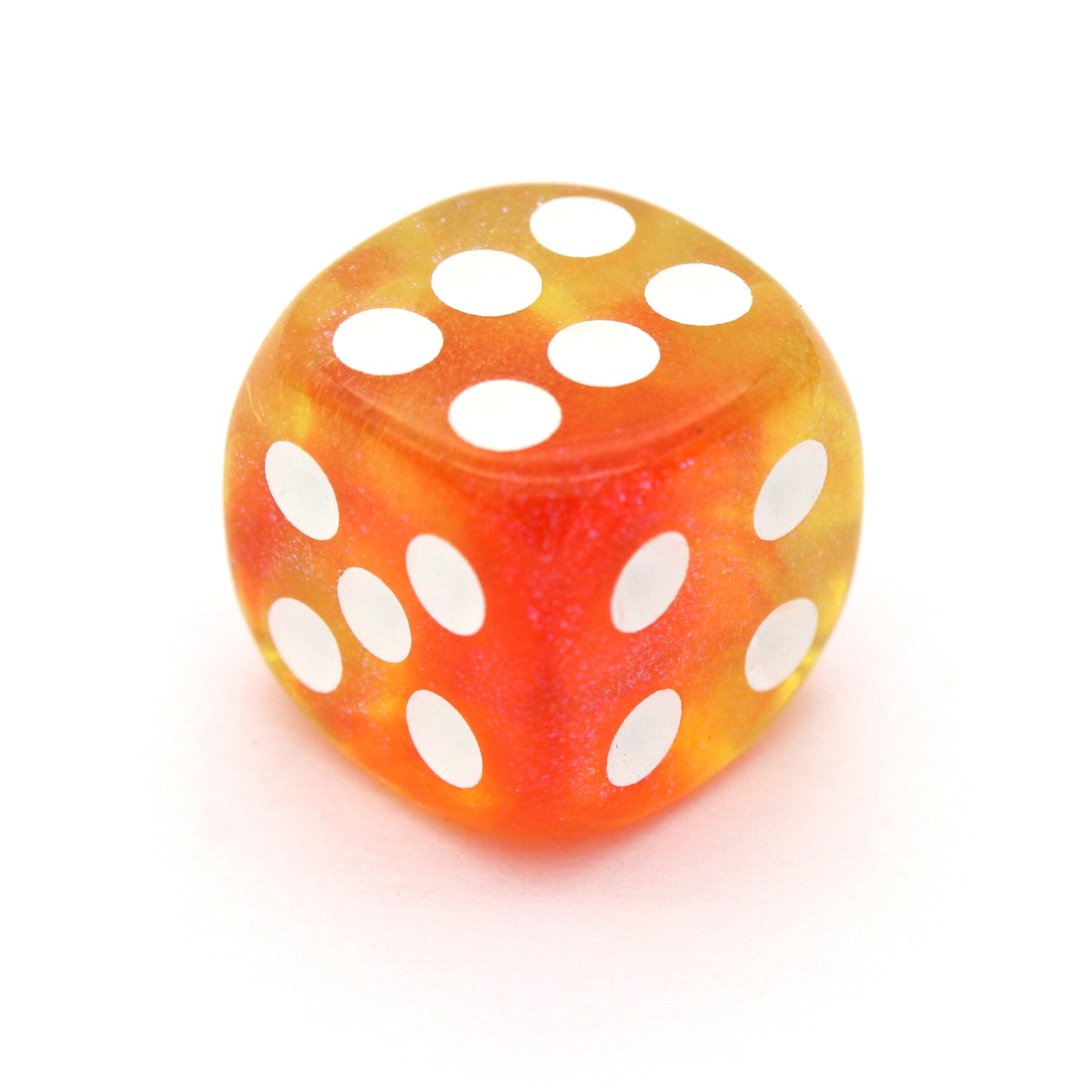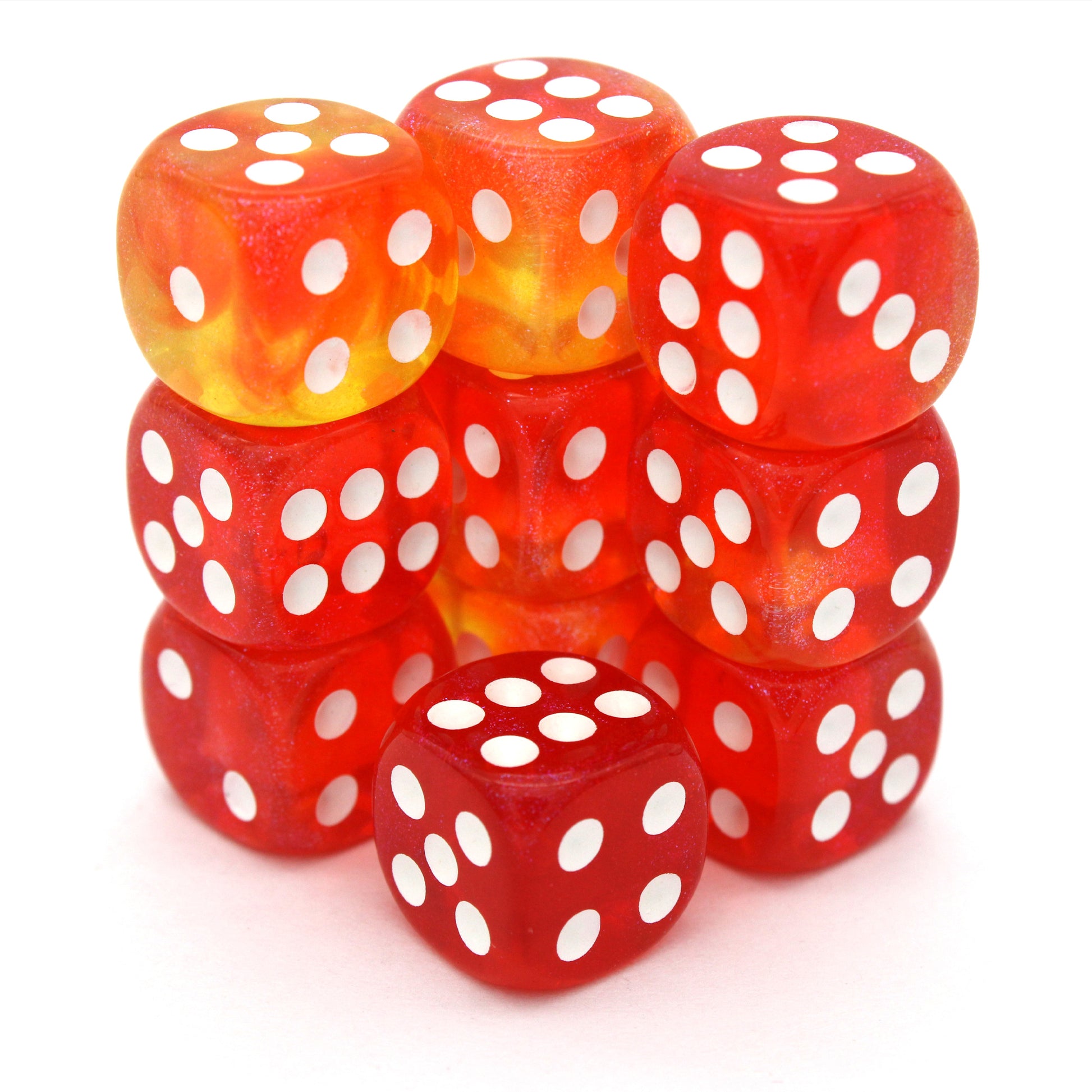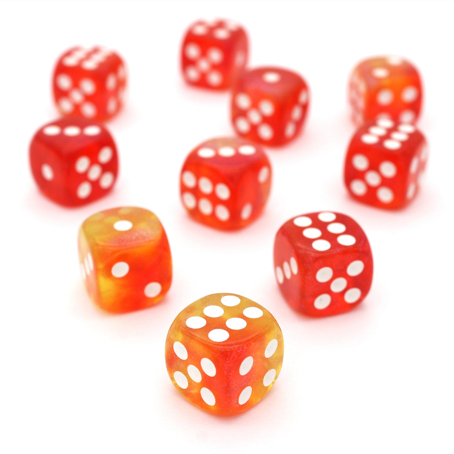 Gummy Guardians is a 10-piece set of swirled, translucent, glittery red and orange 12mm polymer d6s, with white pips. They are part of our Pip-Squeaks collection.
