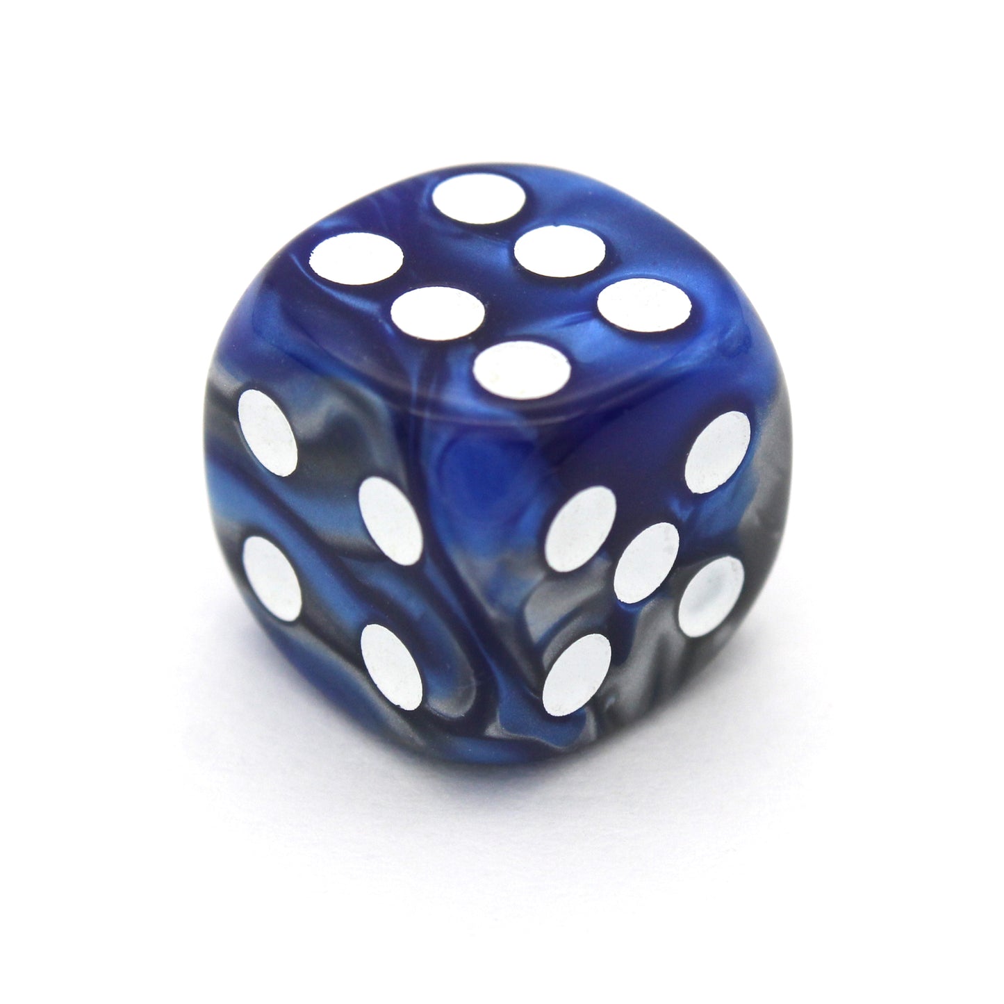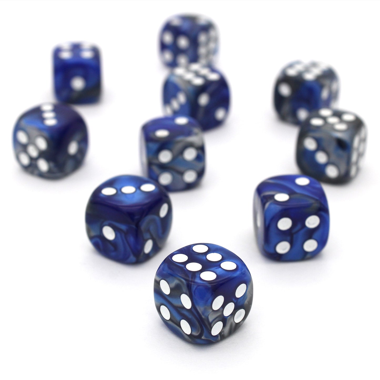Naval Warfare is a 10-piece set of swirled blue and silver 12mm d6s, with pips inked in bright white. They are part of our Pip-Squeaks collection.