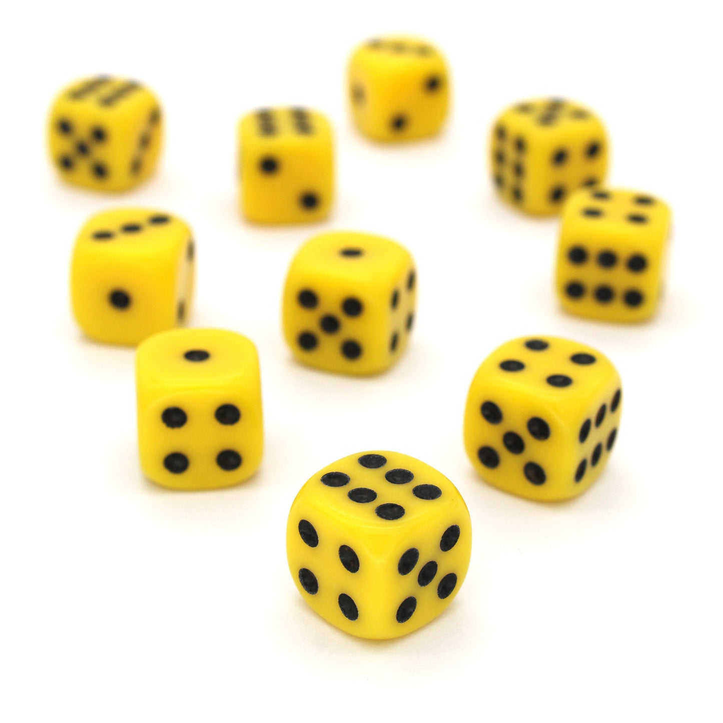 Neon Avengers is a 10-piece set of bright yellow 12mm d6s, with pips inked in black. They are part of our Pip-Squeaks collection.