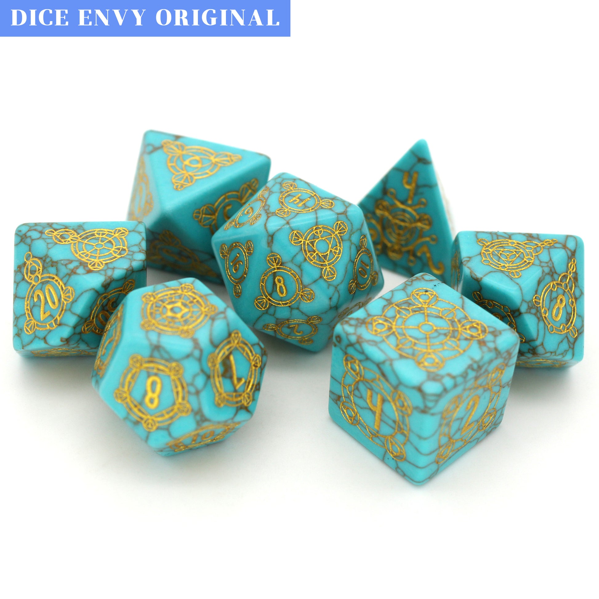 Oasis is a 7-piece set of dice cut from lab-made turquoise, engraved with Dice Envy's exclusive Sigil design and inked in gold.