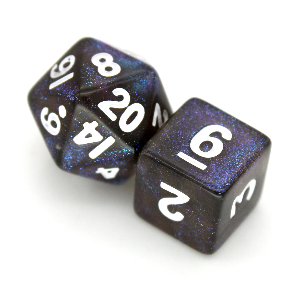Witching Hour is a 7-piece, 13mm, dark grey resin dice set featuring color-shifting indigo-purple micro glitter, inked in white. It belongs to our tiny but mighty Wee Lads collection.