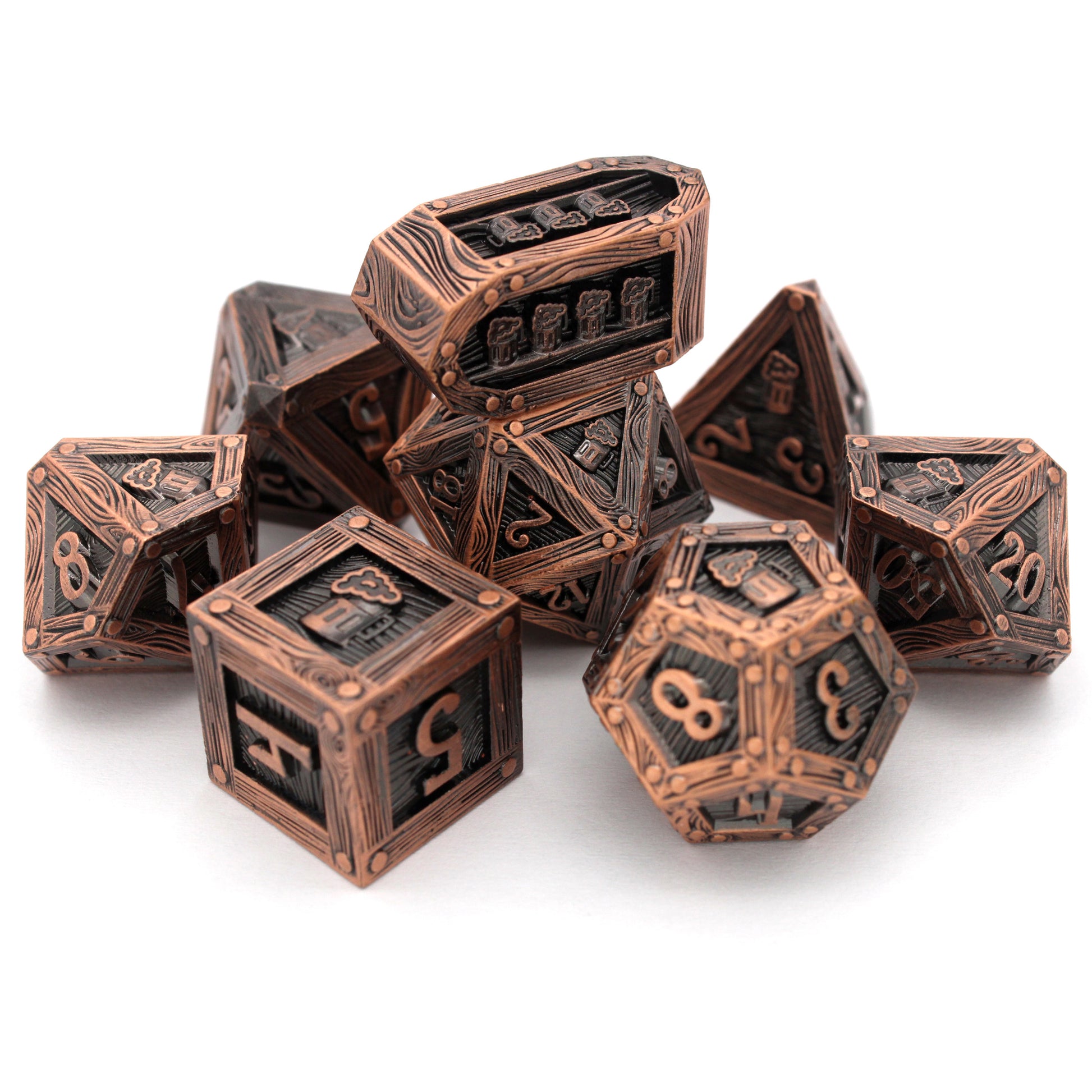 You Meet In A Tavern (by the die) individual dice are aged copper metal dice in our new Crate mold.